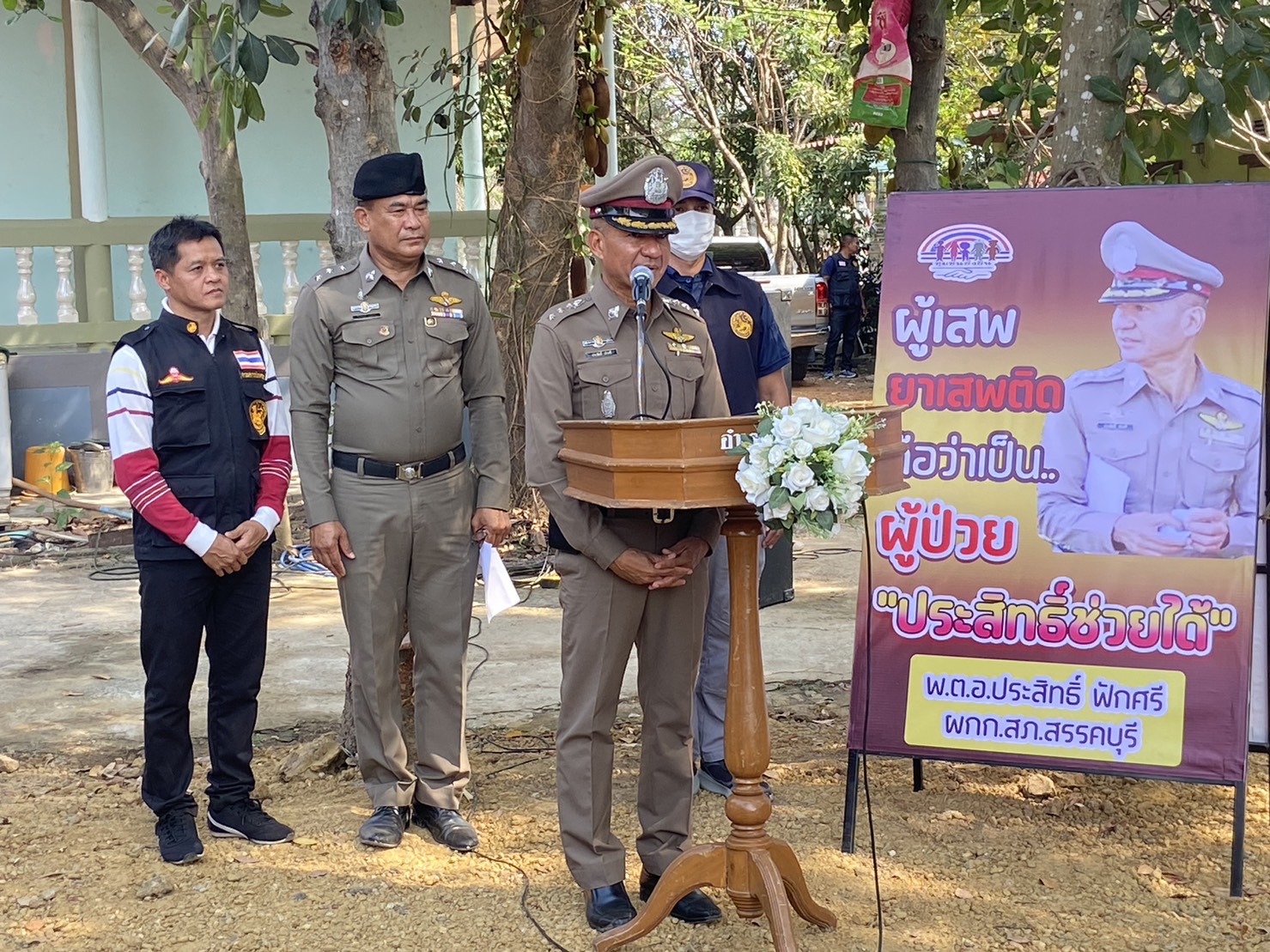 เมื่อวันอาทิตย์ที่ 28 มกราคม 2567 เวลา 14.00 น. น.ส.ดารา เอี่ยมส่งเสริม นายอำเภอสรรคบุรี เป็นประธานปล่อยแถวค้นหาผู้เสพยาเสพติด เพื่อแก้ไขปัญหายาเสพติด แบบครบวงจร ตามยุทธศาสตร์ชาติฯ ทำการเอ็กซเรย์ค้นหาผู้เสพยาเสพติดเพิ่มเติม ในพื้น ม.1 – ม.5 ต.แพรกศรีราชาฯ พร้อมตรวจเยี่ยมผู้ป่วยที่สมัครใจเข้ารับการบำบัดรักษา และเยี่ยมเยือนประชาชนในพื้นที่ พร้อมมอบสิ่งของเพื่อเป็นขวัญและกำลังใจ โดยมี พ.ต.อ.ประสิทธิ์ ฟักศรี ผกก.สภ.สรรคบุรี พร้อมด้วย เลขาฯ ปปส., ข้าราชการตำรวจชุดปฏิบัติการชุมชนยั่งยืน ตำรวจชุดหนึ่งตำรวจหนึ่งหมู่บ้าน ผู้อำนวยการ และเจ้าหน้าที่ รพ.สต.วัดโพธาราม เจ้าหน้าที่ฝ่ายปกครอง นายสมจิตร นิลจันทร์ กำนันตำบลแพรกศรีราชา ผู้ใหญ่บ้าน ม.1 – 5 ต.แพรกศรีราชาฯ ผู้ช่วยผู้ใหญ่บ้าน , อสม. ร่วมกิจกรรมโครงการฯ ณ วัดขุนสรรค์สามัคคี ม.1 ต.แพรกศรีราชา อ.สรรคบุรี จว.ชัยนาท