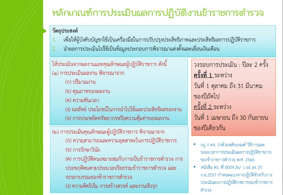 - กฎ ก.ตร. ว่าด้วยหลักเกณฑ์ วิธีการและระยะเวลาการประเมินผลการปฏิบัติราชการของข้าราชการตำรวจ พ.ศ.๒๕๖๖