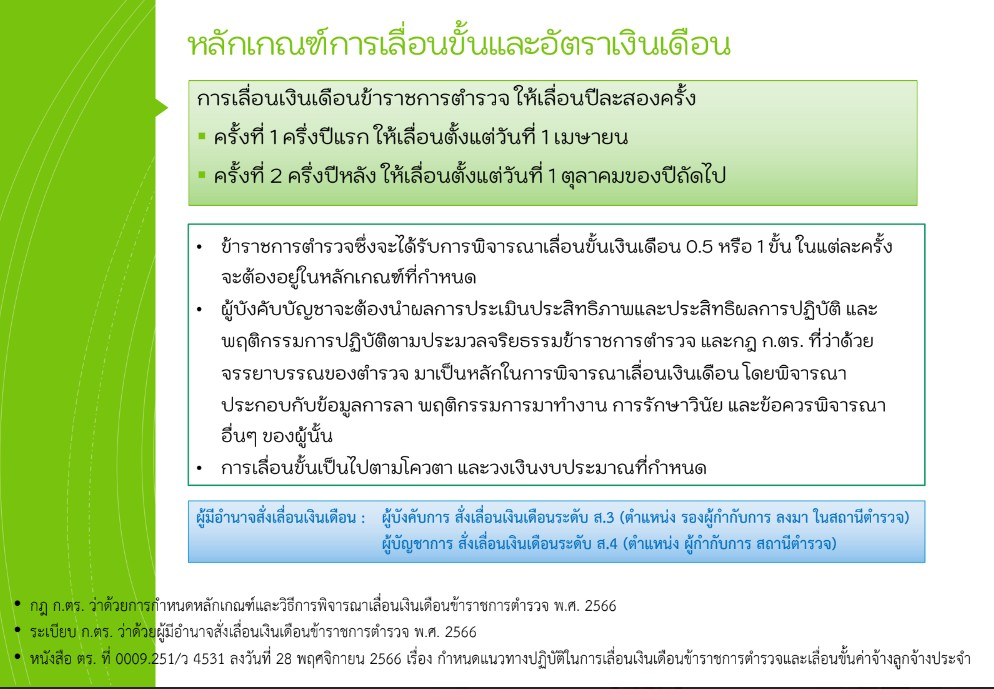 - แนวทางปฏิบัติการเลื่อนเงินเดือนข้าราชการตำรวจและเลื่อนขั้นค่าจ้างลูกจ้างประจำ ตามหนังสือ ตร.ที่ ๐๐๐๙.๒๕๑/ว ๔๕๓๑ ลง ๒๘ พ.ย.๒๕๖๖