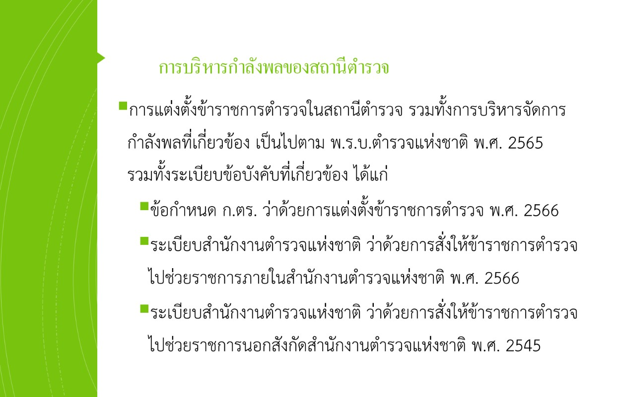 - ระเบียบสำนักงานตำรวจแห่งชาติ ว่าด้วยกาารสั่งให้ข้าราชการตำรวจไปปฏิบัติราชการภายในสำนักงานตำรวจแห่งชาติ พ.ศ.2566
