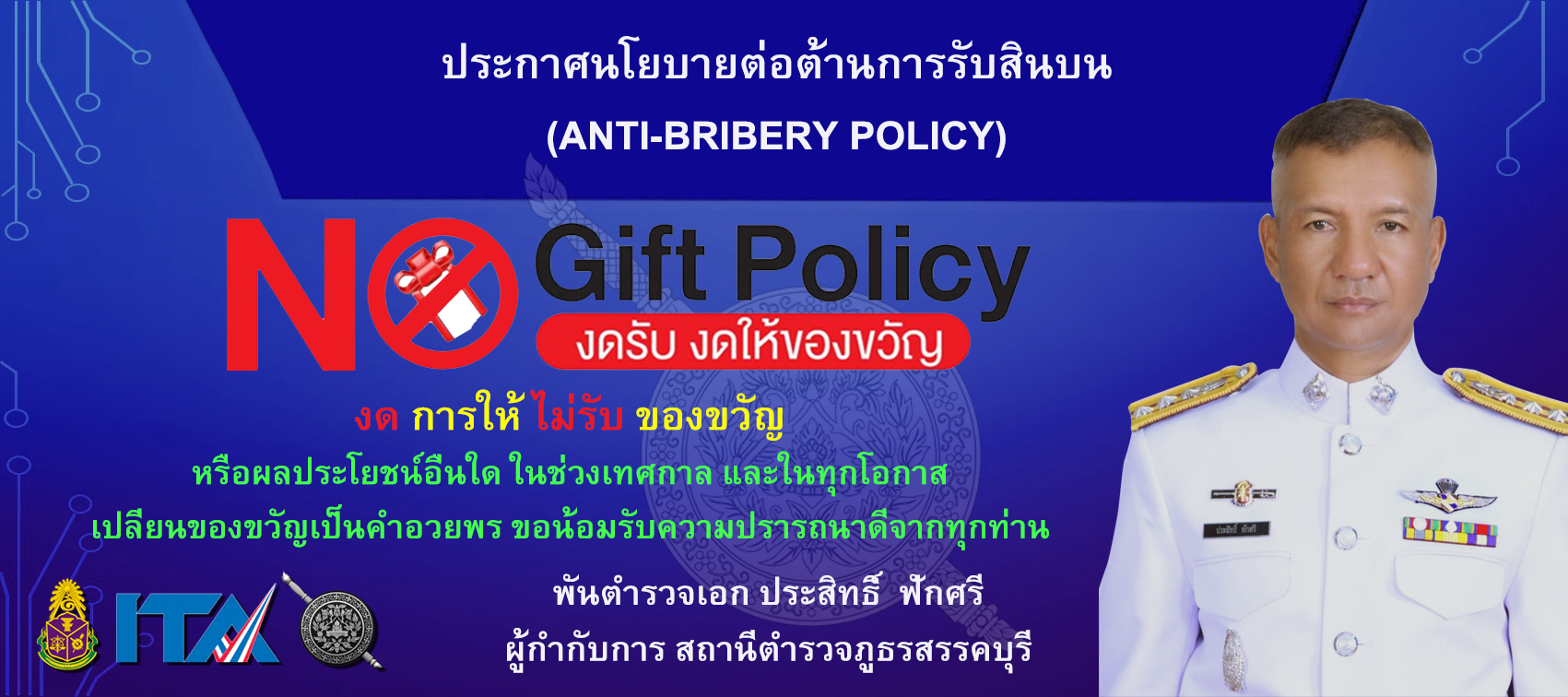 สถานีตำรวจภูธรสรรคบุรี ขอแสดงประกาศนโยบายการต่อต้านการรับสินบน (Anti-Bribery Policy) โดย พ.ต.อ.ประสิทธิ์  ฟักศรี ผกก.สภ.สรรคบุรี และ ได้เผยแพร่ฉบับแปลเป็นภาษาอังกฤษควบคู่กับฉบับภาษาไทย มีรายละเอียด ด้านล่างนี้